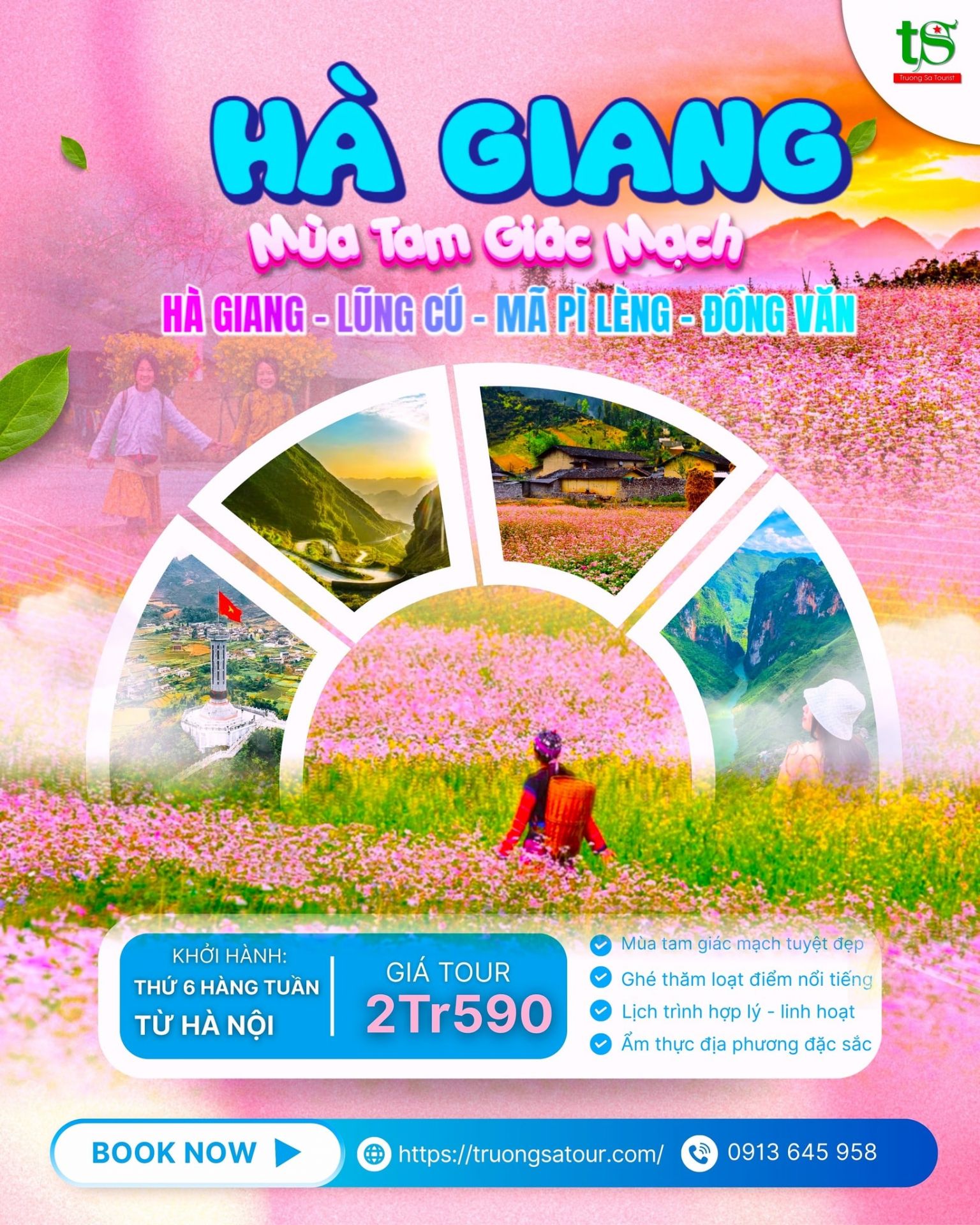 Tour Hà Giang 3 ngày 2 đêm của Trường Sa Tourist sẽ đưa bạn đi qua các bản làng bình dị, chạm đến các cung đường đèo hùng vĩ, ngắm nhìn khung cảnh Hà Giang đẹp như tranh và thư giãn giữa những cánh đồng hoa tam giác mạch của vùng đất địa đầu Tổ quốc.
