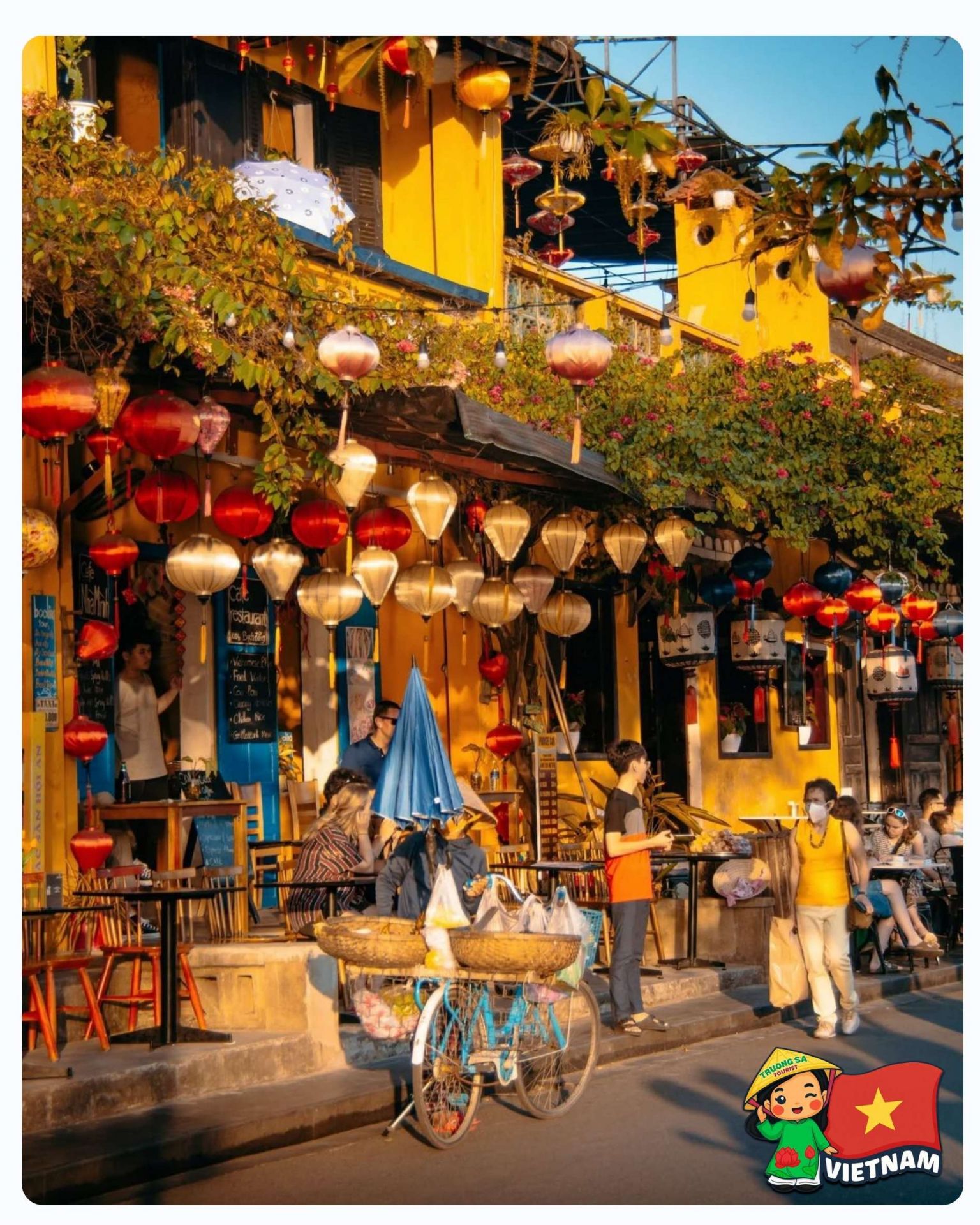 The best way to explore Hoi An Ancient Town is to walk slowly through its small streets and alleys with iconic yellow walls and moss-covered tiled roofs, feeling the timeless beauty at a relaxed pace.