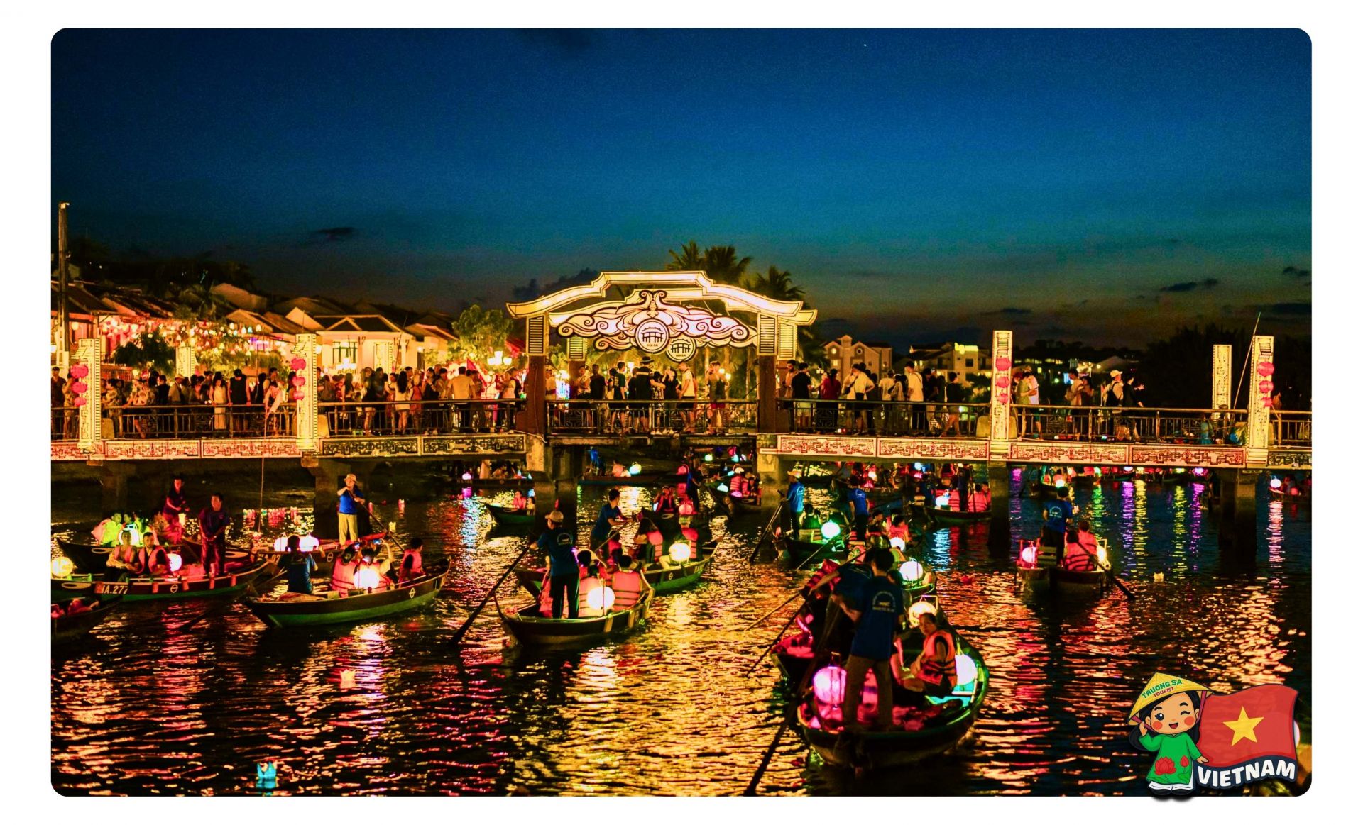 Besides strolling, admiring lanterns, and taking night photos, a boat ride and lantern release is the most emotional activity, especially for first-time visitors. Sitting on a small boat gliding along the Hoai River, the old town glows magically, reflecting on the water, creating a peaceful and romantic scene. Releasing a lantern is not only experiential but also a cultural ritual linked to the Full Moon Festival, symbolizing wishes for peace, luck, and blessings.