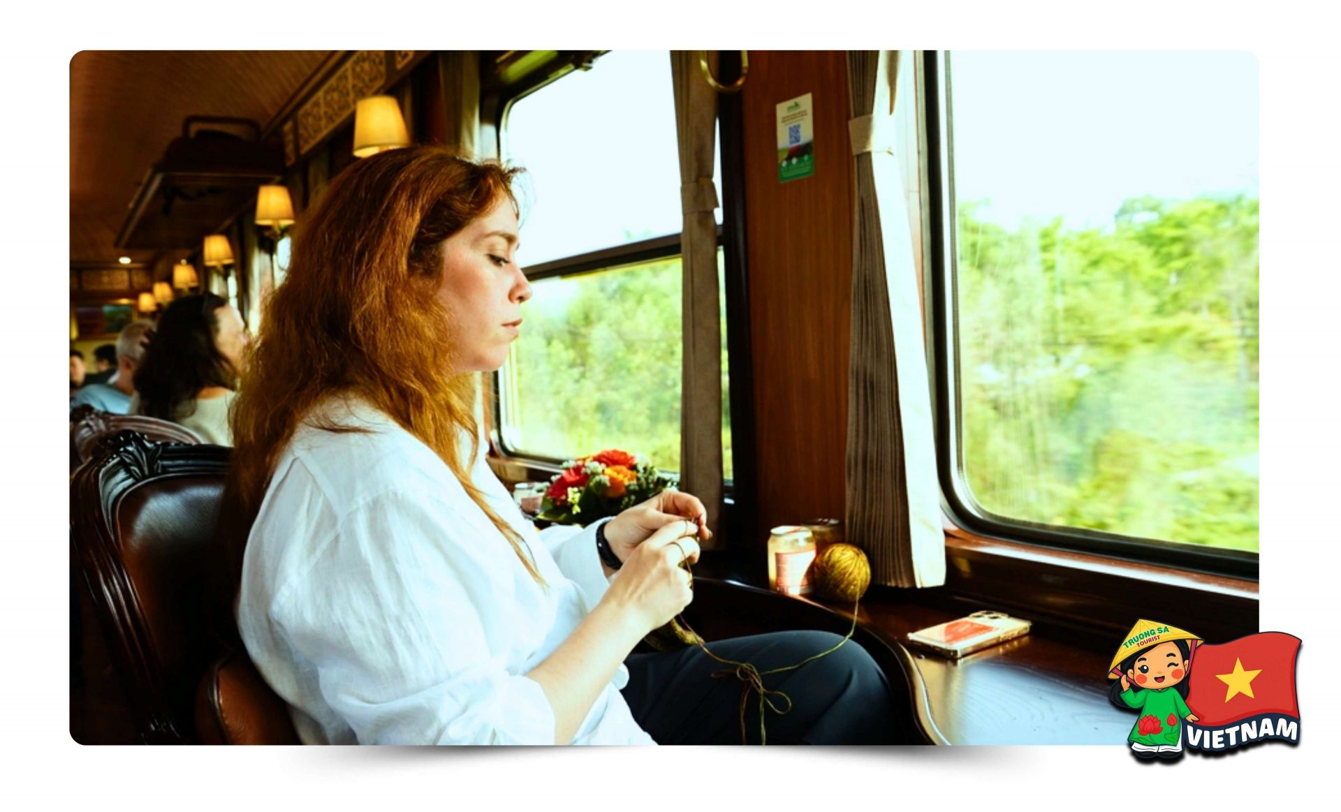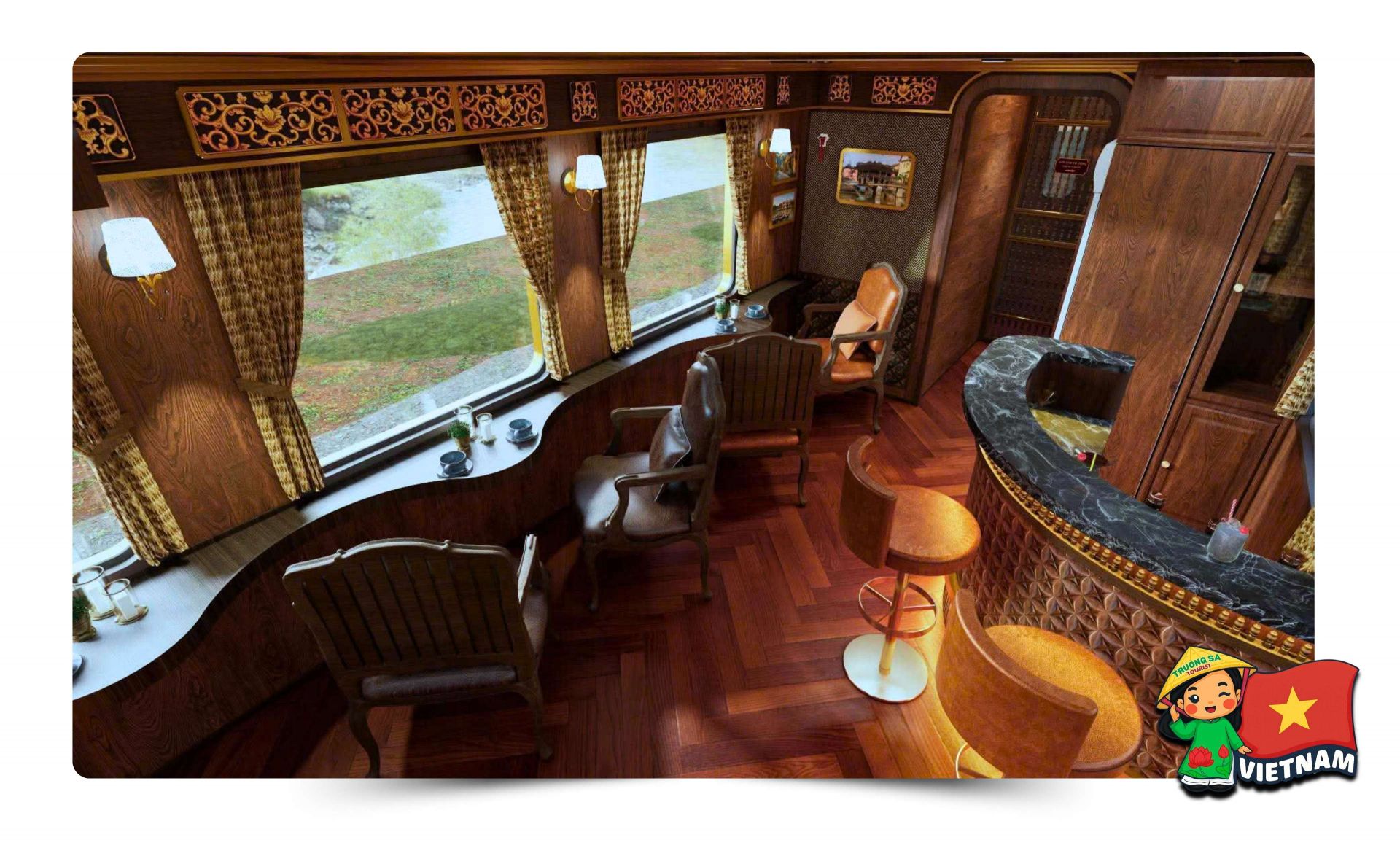 The highlight is the VIP carriage with only 32 seats, optimized for a nostalgic experience. It reflects classic French-style elegance, featuring window-side tables where passengers can enjoy coffee, listen to music, and admire the Hai Van Pass scenery.